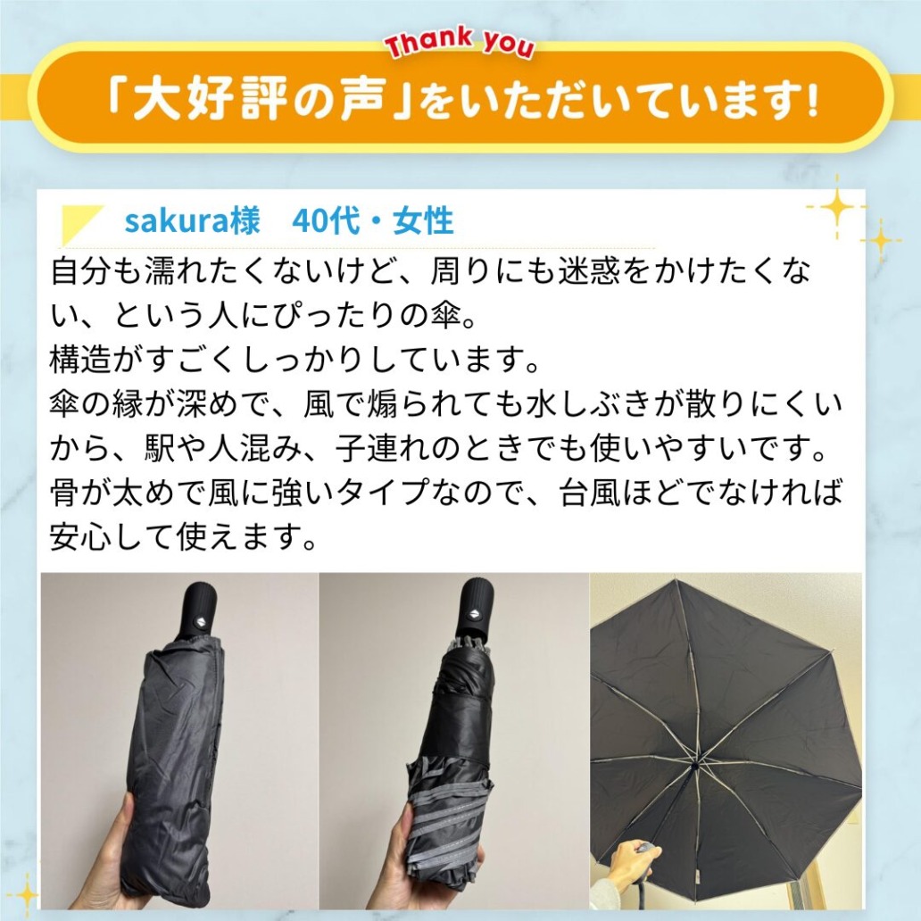 傘の縁が深めで、風で煽られても水しぶきが散りにくいから、駅や人混み、子連れのときでも使いやすいです。
