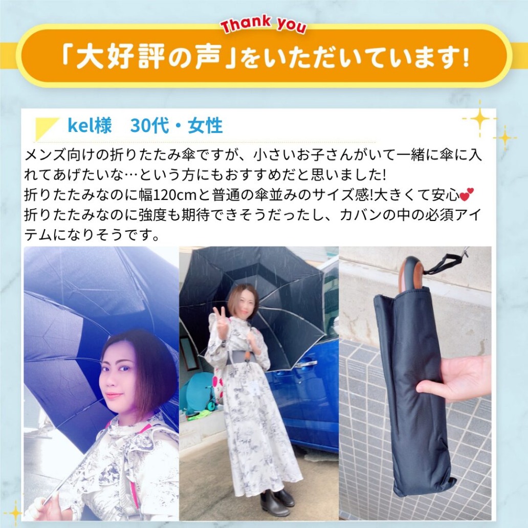 メンズ向けの折りたたみ傘ですが、小さいお子さんがいて一緒に傘に入れてあげたいな…という方にもおすすめだと思いました! 折りたたみなのに幅120cmと普通の傘並みのサイズ感!大きくて安心💕
